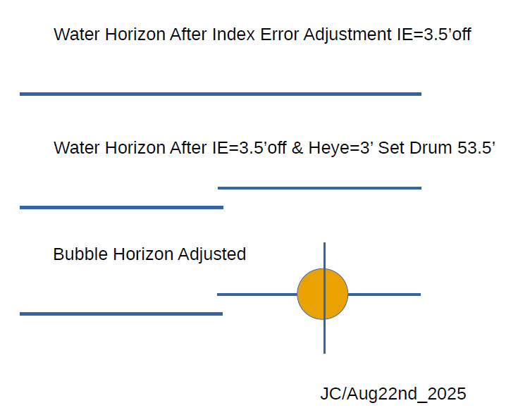 In order to calibrate the Artificial Bubble Horizon, you first adjust the Index Error. In this particular case the IE was 3.5′ off limb so the drum showed 56.5′. My height of eye was 3m so the Dip = 3′. This is added to the Index Error so the drum setting was decreased to 53.5′. This raised the horizon up 3′ as shown in Figure 3 (Ref.1/2). After this was done, I adjusted the Horizon light bulb to full illumination which put the orange circle right on the raised horizon. There is an adjustment screw on the bottom of the unit which was previously calibrated correctly and locked with paint.