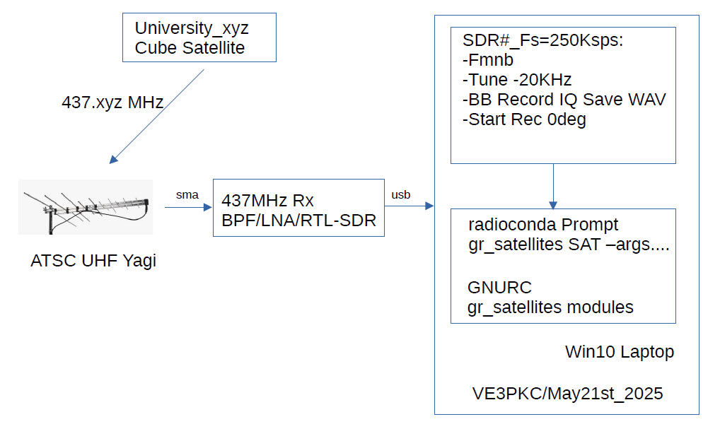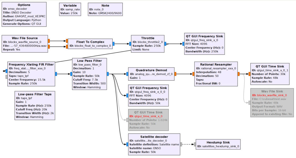 Figure 1 shows the equipment setup. The UHF Yagi is pointed due East. The 433MHz BPF/LNA/RTL-SDR is connected to the Yagi with a sma to catv adapter. A long usb cable then feeds a laptop indoors. SDR# is used and the sampling rate is set at 250Ksps to keep file size down. The frequency is set 20KHz below the satellite frequency. The reason for this is to allow for Doppler shift. On playback, you can measure the actual packet receive frequency then set this in the GNURadio Frequency Translation Filter. The Baseband IQ recorder is used and I start recording the minute my QTH appears in the satellite footprint. The satellite pass is typically about 5-8 minutes so the files get big. You can trim them later in Audacity. I keep the gain low at 19.7dB, but this depends on the active QRM, so I adjust this for minimum intermod. Figure 2 shows the GNURadio schematic used with gr_satellites Satellite Decoder set for “ENSO”.