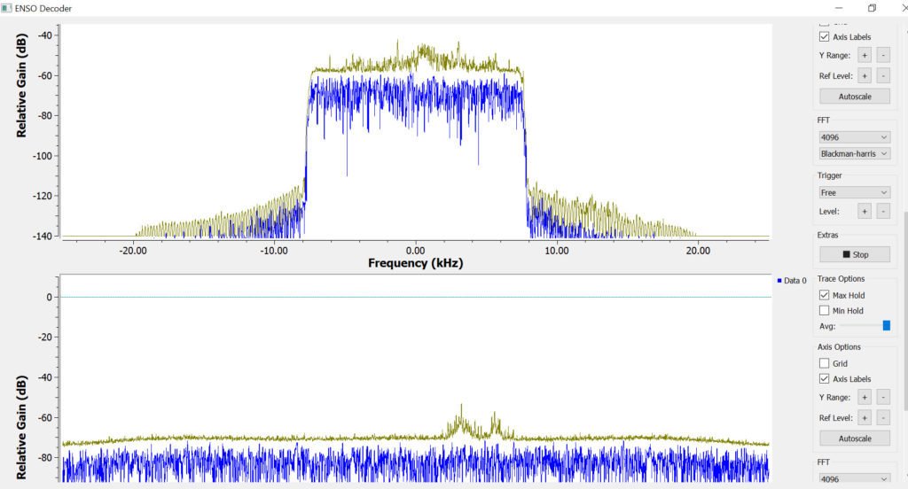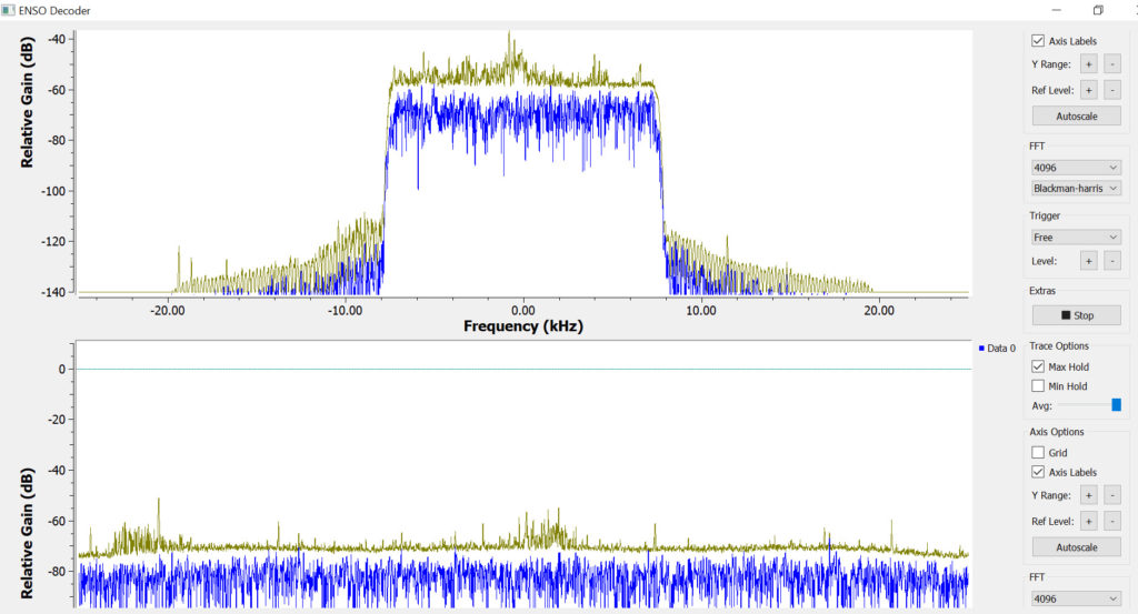 Figure 5 shows a close pass of ENSO at Elev=38deg on Nov3rd and Figure 6 shows the GNURadio decode. The SDR# center frequency was 436.500MHz and the freq shift was 9KHz.