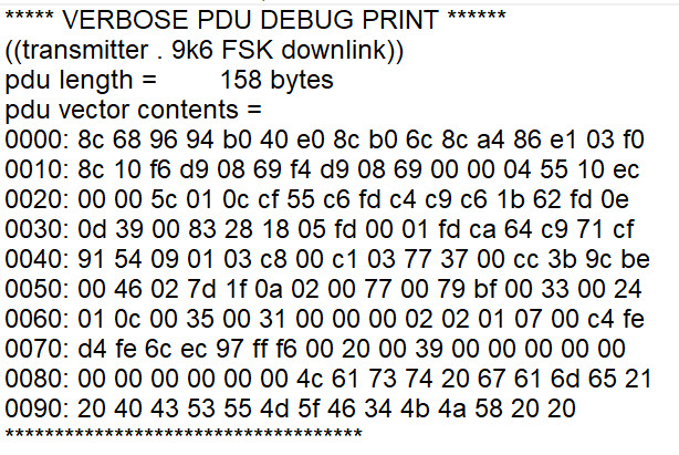 Figure 3 shows a close pass of ENSO at Elev=55deg on Nov1st and Figure 4 shows the GNURadio decode. The SDR# center frequency was 436.480MHz and the freq shift was 15.5KHz. The WAV file repeats and the decoder gave several decodes and finally settled on 15bytes.