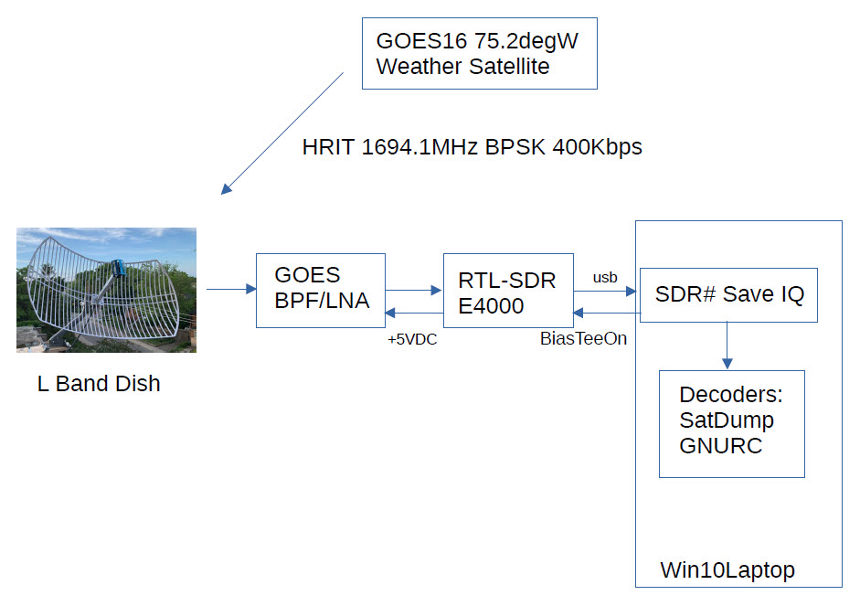 Figure 1 shows the equipment setup. An L band dish receives at 1694.1MHz and sends signals to a GOES BPF/LNA and then to an E4000 RTL-SDR. Reception is by SDR# (Fs=2.4Msps/Gain=29dB). The RTL-SDR has a biasTee which feeds 5VDC to the BPF/LNA module. Signals are saved as baseband IQ for later decoding using SatDump.
