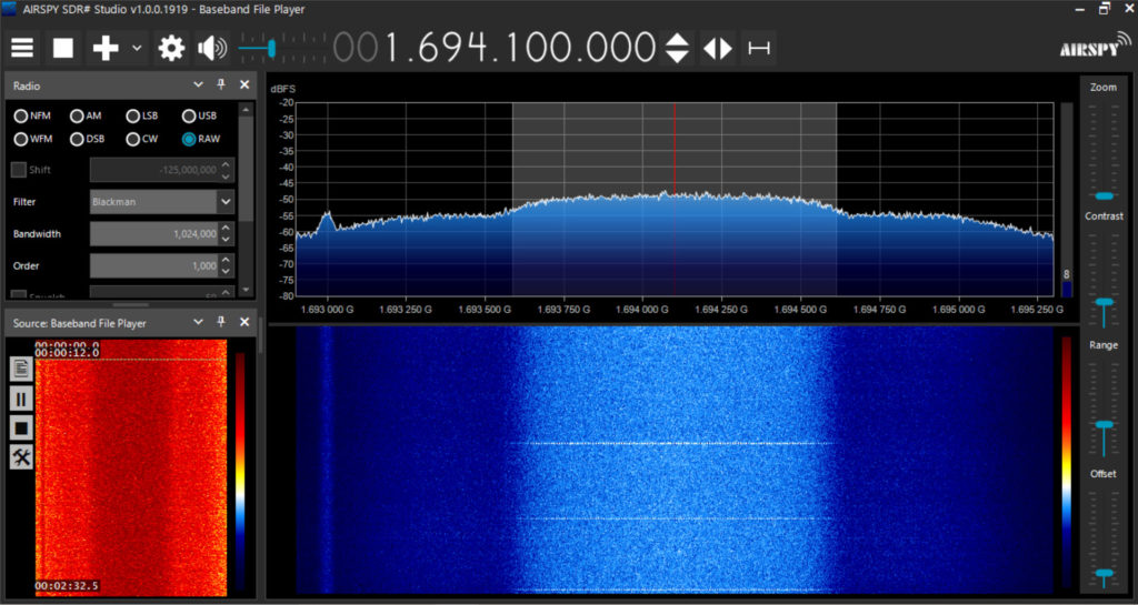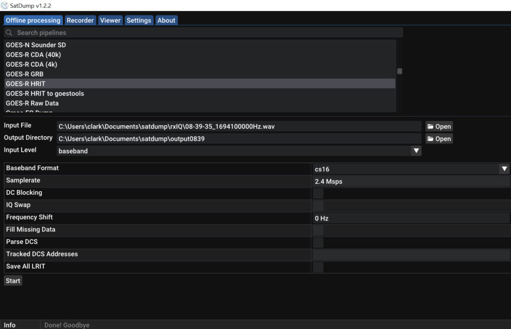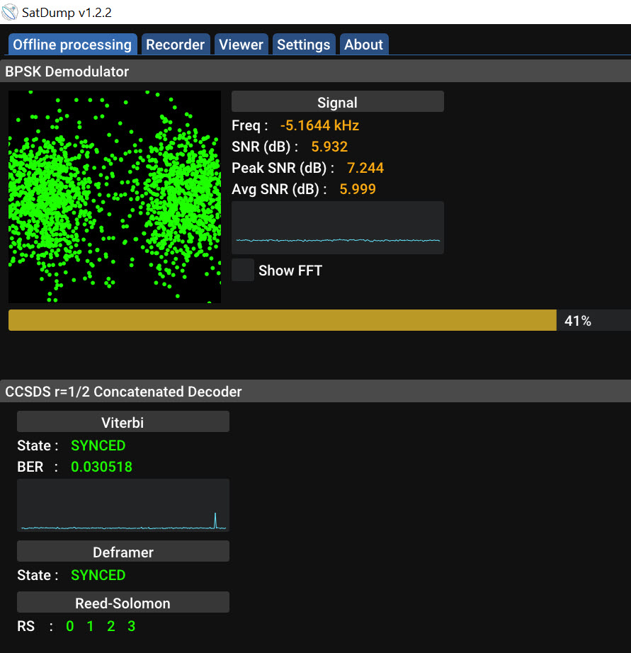 Figure 2 shows SDR# playing back a saved baseband IQ file. The dish is adjusted by hand to give a maximum SNR by viewing the top of the signal spectrum and the noise floor. This varied between 5-7dB as there was a lot of wind and the dish mount was not very stable. Figure 3 shows the SatDump Offline Processing Screen where you open the IQ file and select an output directory for the results. Figure 4 shows SatDump processing the file.